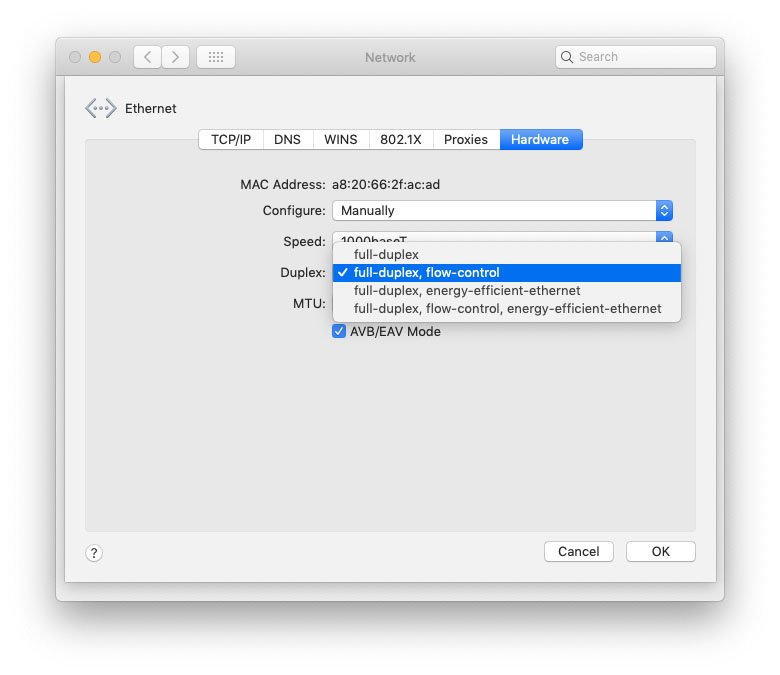 Then we went to Apple / System Preferences / Network… selected Ethernet.. clicked on Advanced… Hardware…