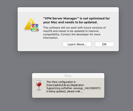 after opening, the system is reminding us, that this app will not work on future versions on macOS starting with Catalina that runs only 64 bit apps. Hit OK to ignore the message…