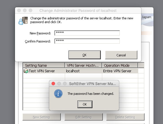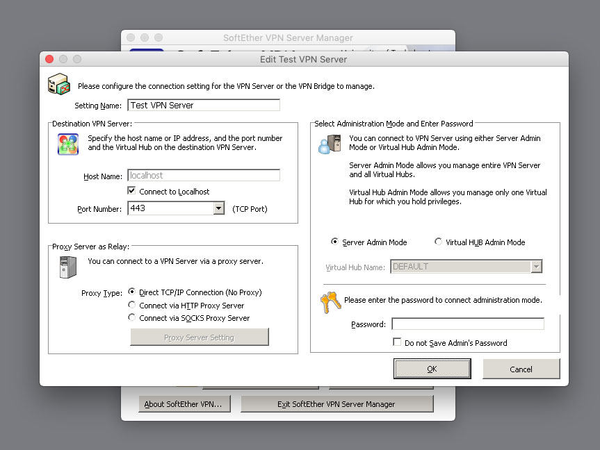 In the windows that appears click on New Setting… name the settings as ‘Test VPN Server’, enter the IP of your server, or if you are running the Manager locally, then simply check the Connect to Localhost setting. Leave the password field empty and close the window with OK.