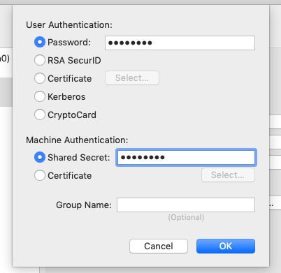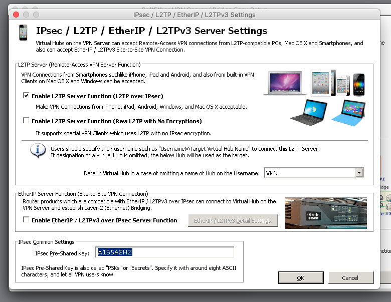 Enable the L2TP Server Function which provides LPTP over IPsec that is required to connect all modern OSes as macOS, iOS, Android or Windows. Also specify a Pre-Shared key.