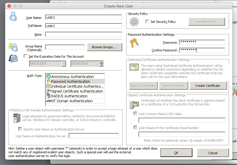 Let’s create our first user by entering a name and a password – we are not going to cover how to use a certificate in this guide.