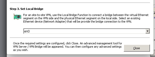 after defining our test user and returning to the previous windows as a third step choose en0 as a local bridge – without enabling this our VPN server will not provide a DHCP service and although users will be able to authenticate, they will get no IP address and the connection will be ended.