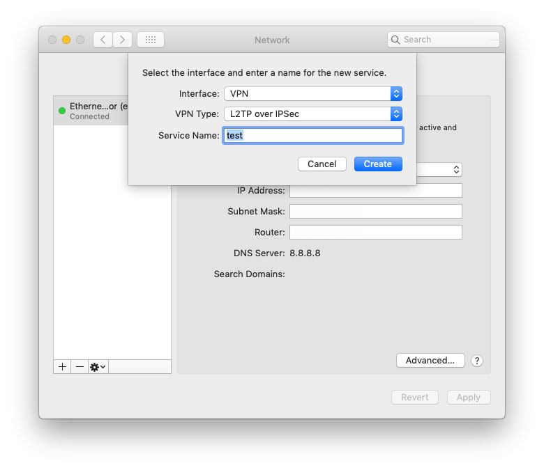 Finally we are ready to configure the VPN connection on a client machine. Go to Apple / System Preferences / Network… click the plus sign, choose VPN from the Interface list and L2TP over IPSec for the VPN Type. You can give any name for the Service.
