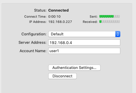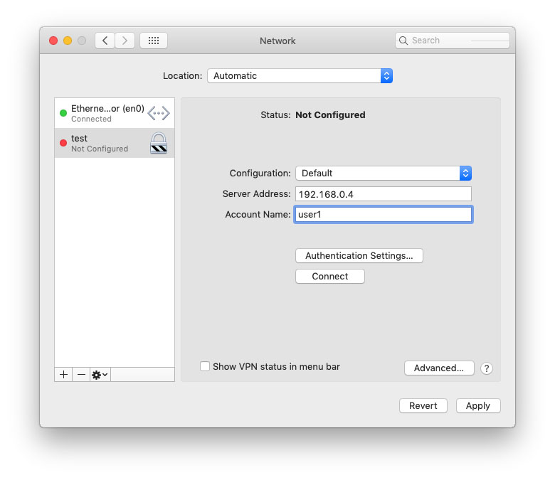 in the main window select the ‘Test VPN Server’ from the list and hit the Connect button. A window will prompt you to give a password for the server – don’t forget it as you will need it when changing its settings.
